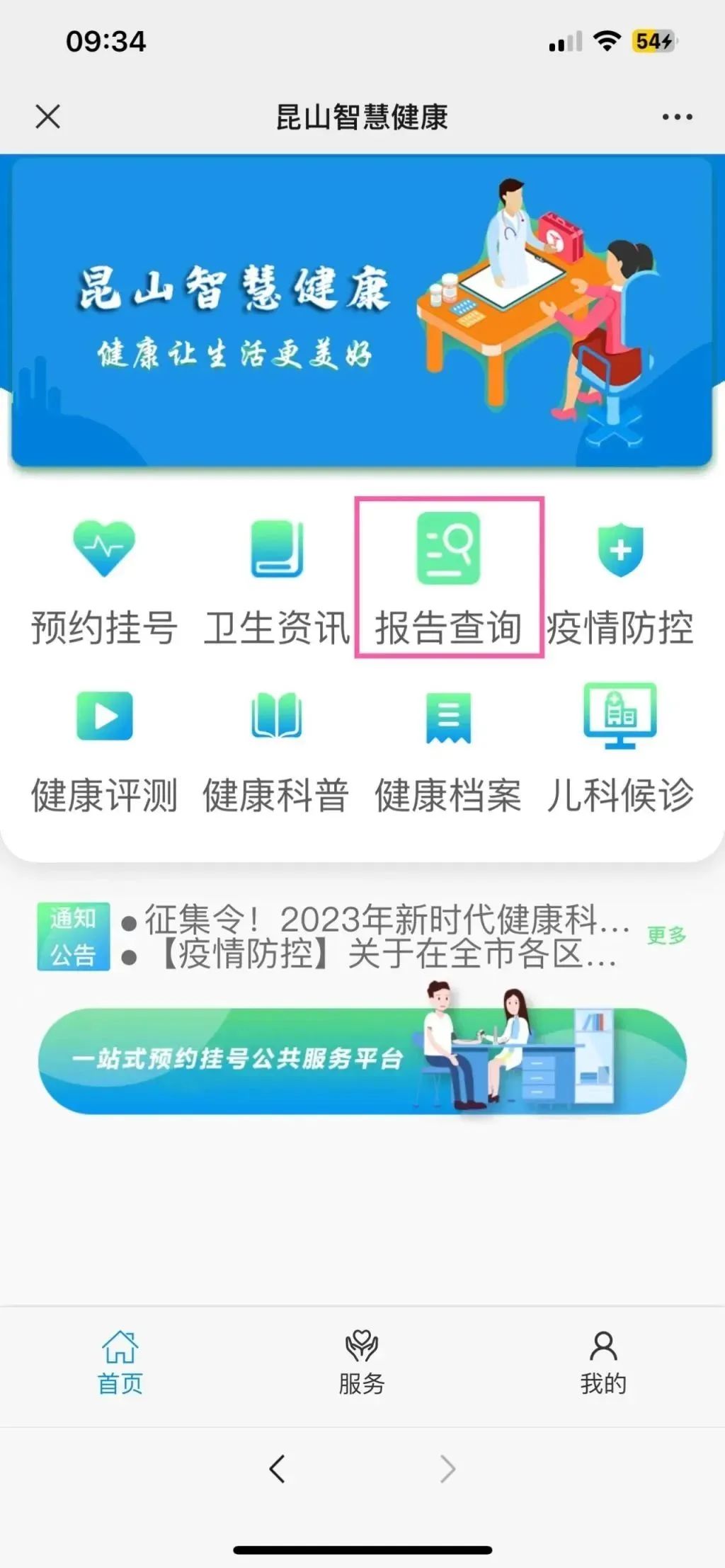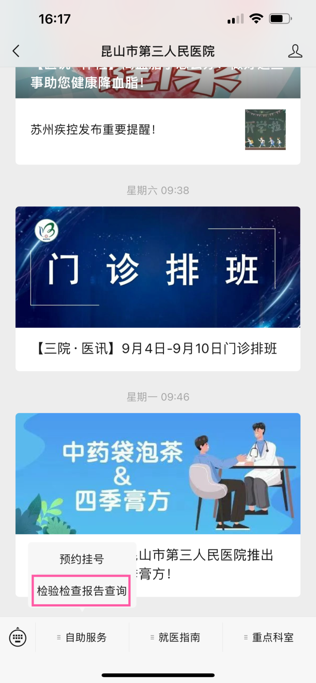 查询检查、检验报告,可在对应时间持凭条扫码打印,或在“昆山市第三人民医院”微信公众号上查询,步骤如下: