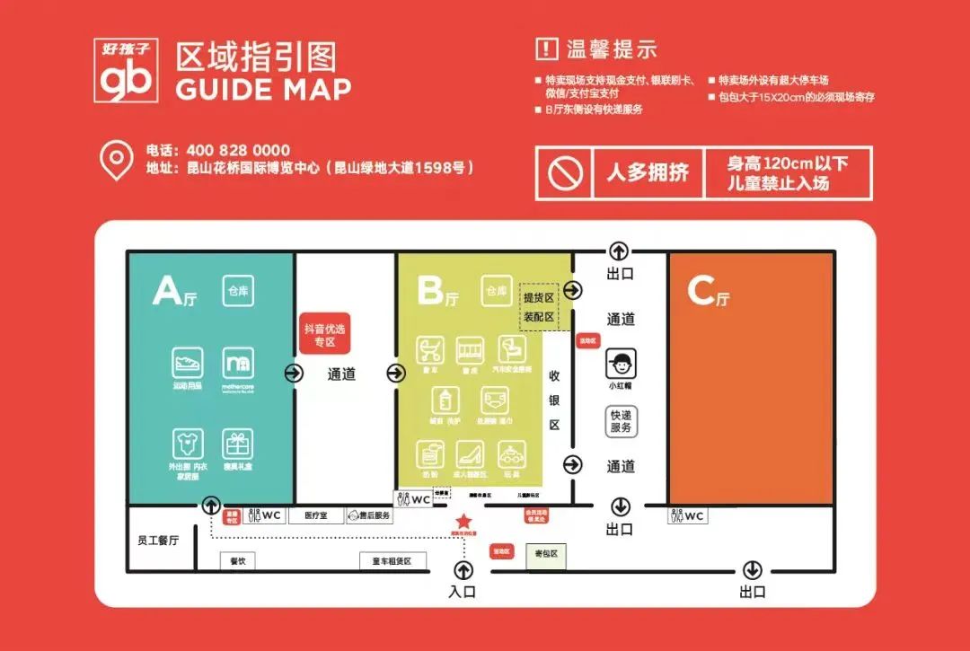 为保证儿童安全,身高120cm以下儿童禁止进入卖场,可在休息区、儿童游玩区等候。