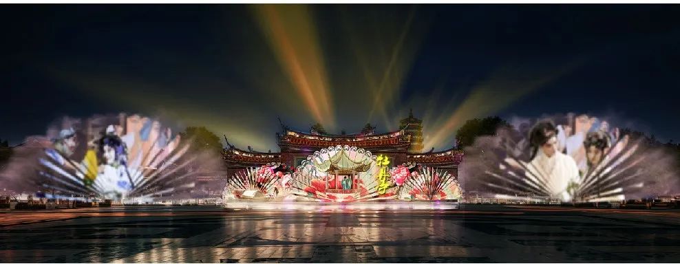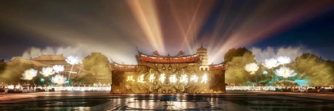 慧聚文化广场片区以九龙壁及两边河道扇形水幕为载体,以“双莲并蒂 福满两岸”为主题,通过光雕投影技术,形成时长约8分钟的沉浸式光影秀。