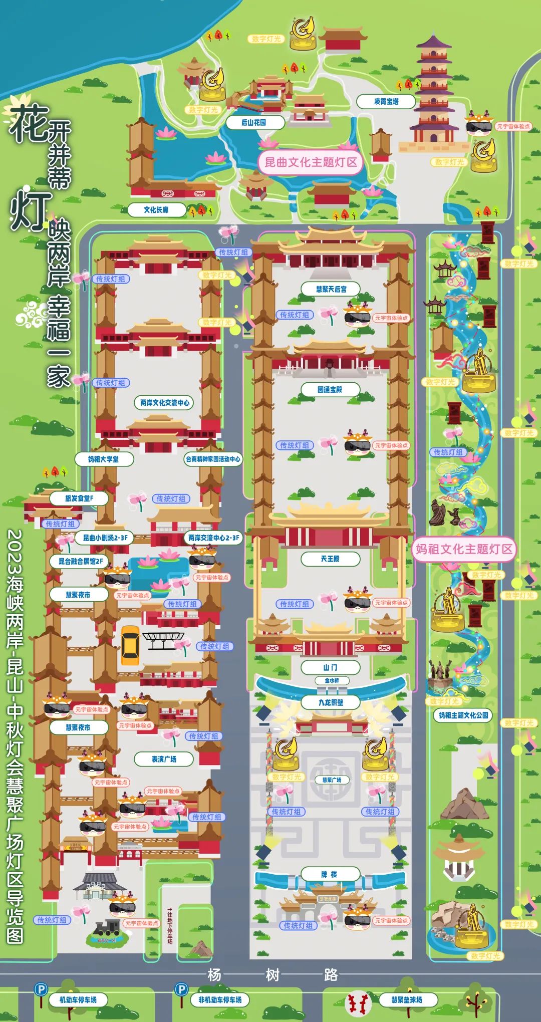 在天后宫广场设臵第四届“昆山妈祖杯”海峡两岸青年花灯设计比赛获奖作品灯组。在昆山慧聚广场各通道、商业街设臵以两岸民俗、风物等为主题点缀亮化灯饰。突出地铁站点的连接,在地铁站与慧聚广场联通道路设臵引导灯组。