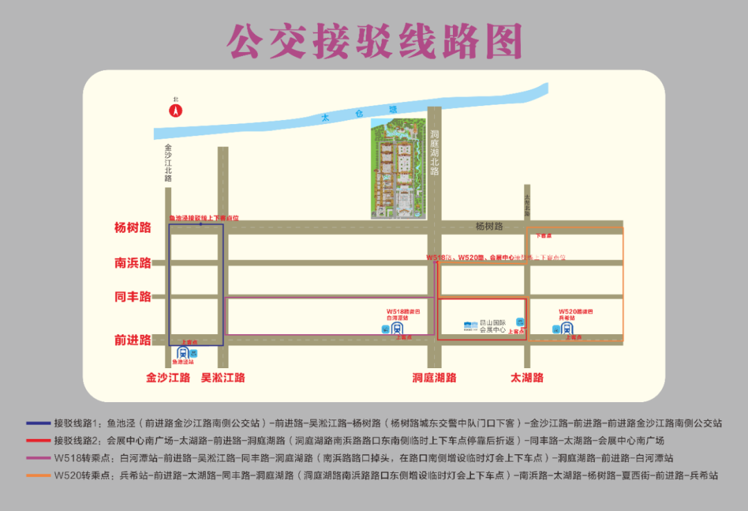为方便市民朋友通过公共交通(轨道交通)等绿色出行,主办方将安排2条公交接驳车线路(国际会展中心站和鱼池泾站),以及原有的两条微巴士(W520和W518)增设灯会临时停车点,换乘点分别为白河潭站及兵希站。详情见下图: