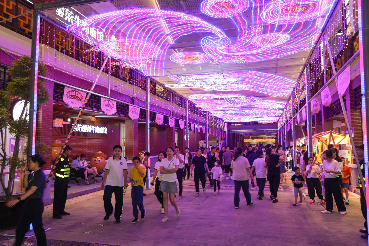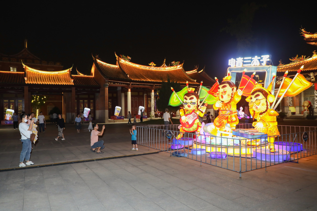 除了科技感十足的灯光秀,一系列制作精美的传统灯组也是游客们的必打卡项目。“玉兔呈瑞”“花开并蒂两岸亲”“电音三太子”“中秋物语”等造型别致、制作精美的传统灯组吸引着大家的目光,不少游客还身着传统服饰,摆拍合影。