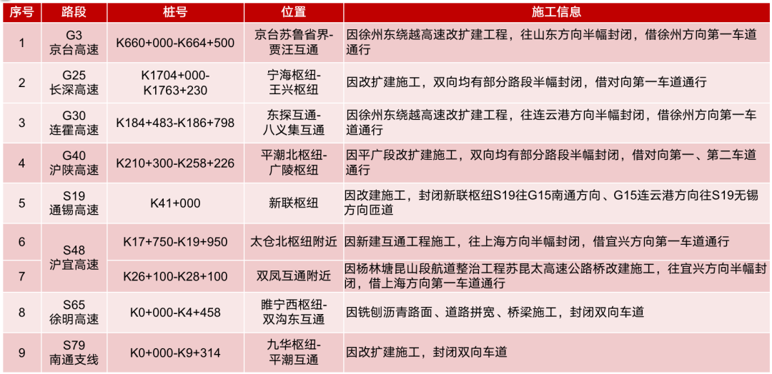 中秋国庆期间,省内有G30连霍高速、G40沪陕高速等9处高速公路施工路段、节点,请注意现场交通标志提示!