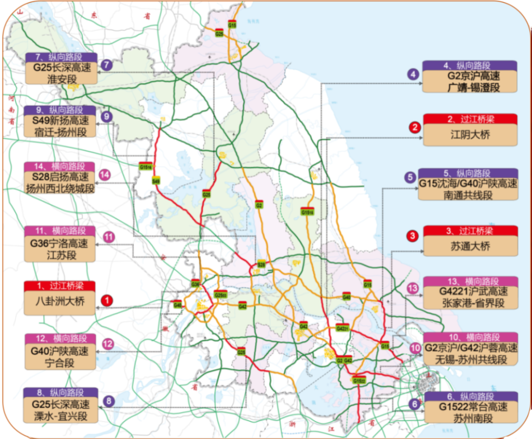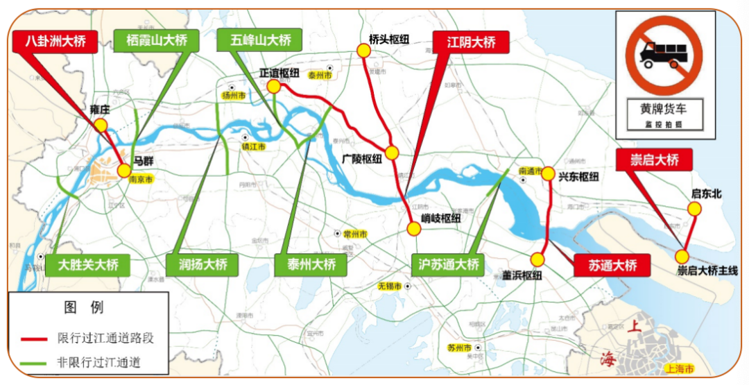 中秋国庆期间,八卦洲大桥、江阴大桥、苏通大桥、崇启大桥实施黄牌货车限时错峰出行政策,限行时段为10月5日和6日每日8时-22时,限行路段如下。