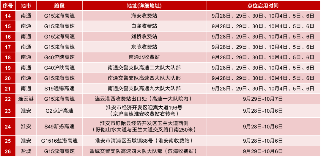 中秋国庆期间,G2京沪高速、S49新扬高速等高速公路沿线共有6个服务区有车位减少、服务区关闭等特情,请注意!