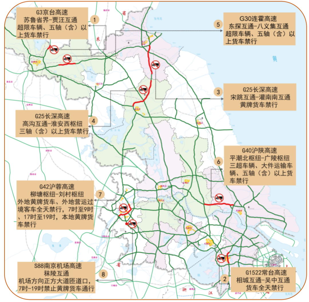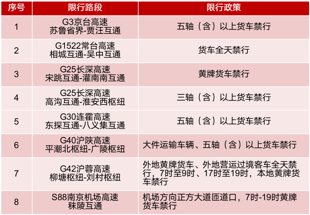 【注】除悬挂蓝牌、承担运送鲜活农产品、高速公路抢险救灾和服务区油品保障运输车辆等涉及国计民生运输任务的载货汽车外,其它黄牌货车一律限行。