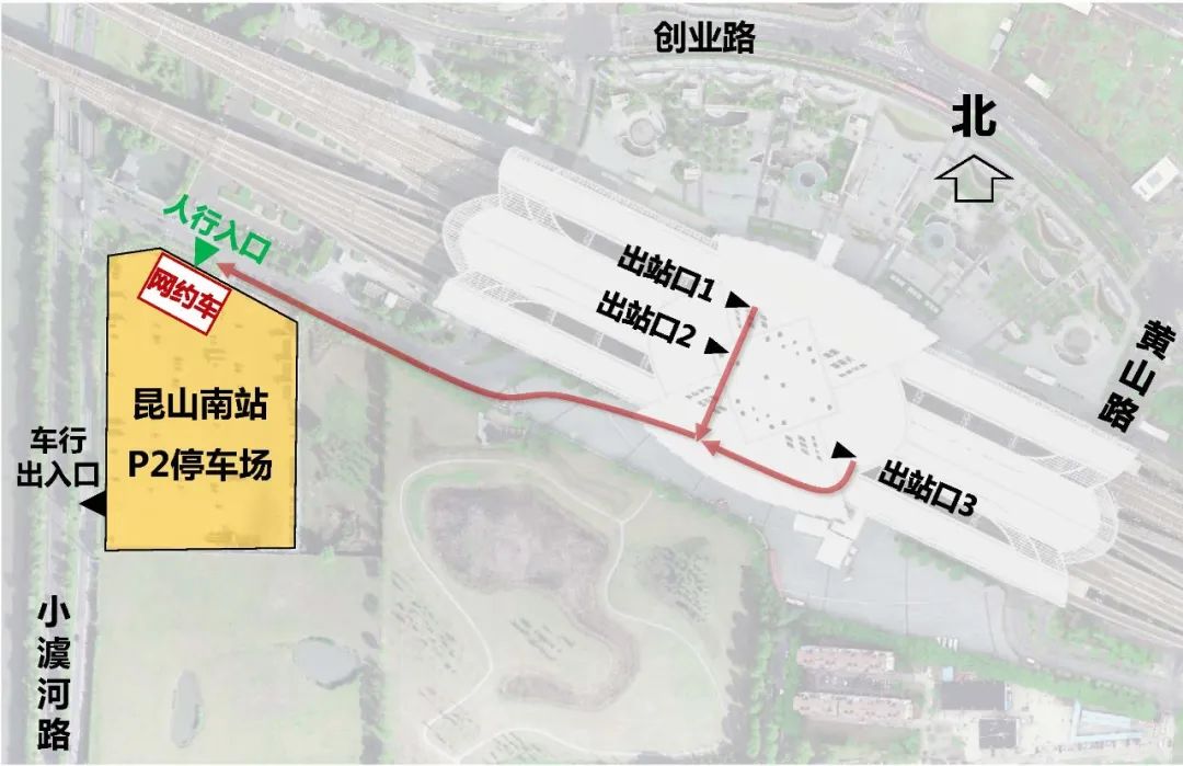 P2停车场为昆山南站网约车听单区。同时,P2停车场设置网约车候车区,距离昆山南站出站口约400米,在昆山南站乘坐网约车出行的市民可步行至此上车。