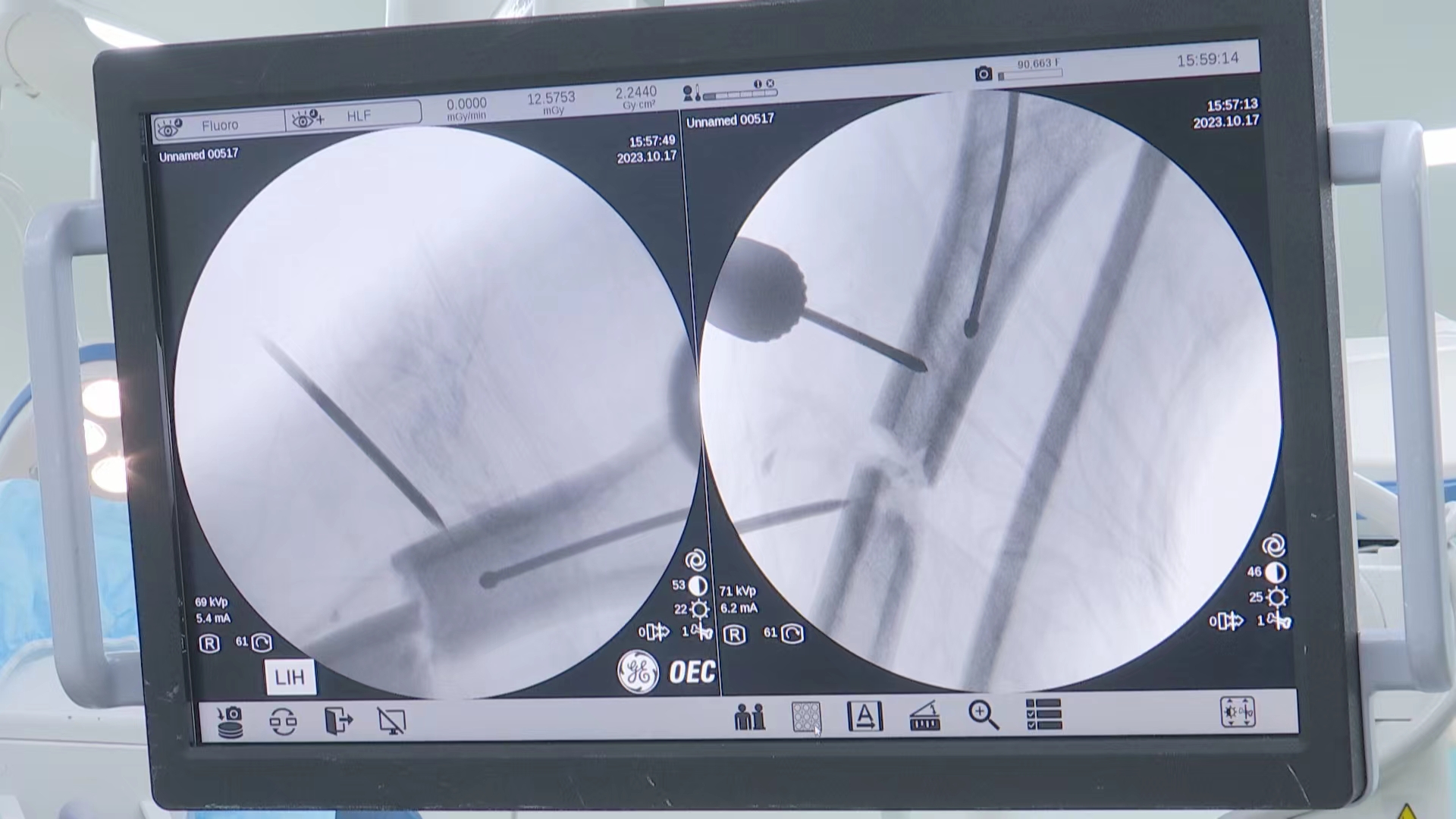 市一医院借助先进的混合现实技术,使医生在术中可以直观、清晰地看到髓内钉在髓腔内的实时形态,省去了传统手术需要的诸多髓内钉远端定位操作流程和繁琐的工具使用,不仅节约了手术时间,提高了手术效率,还不需要反复在X线下透视,消除了患者及医生不必要的身体伤害,更减缓了患者痛苦。