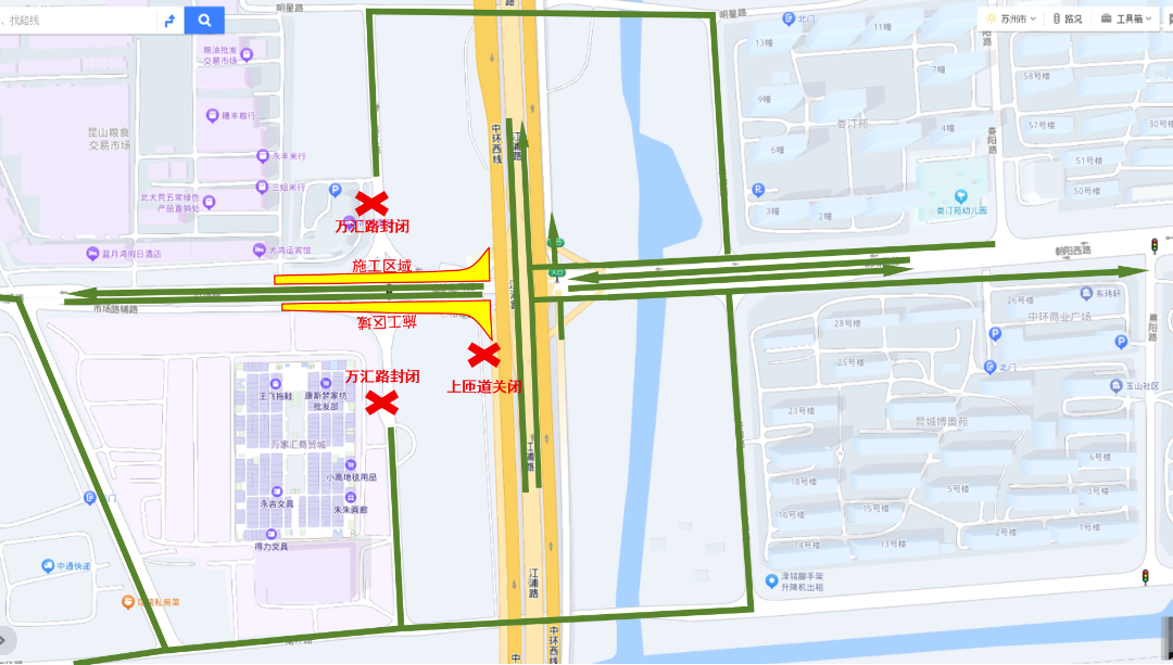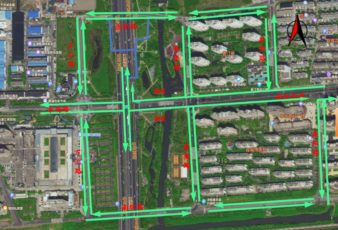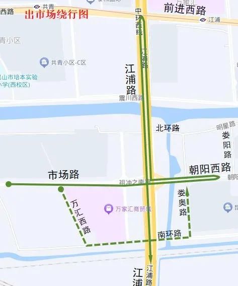 市场路-朝阳西路隧道-调头至朝阳西路向西-江浦路(或万汇西路-南环路-娄奥路-朝阳路)。