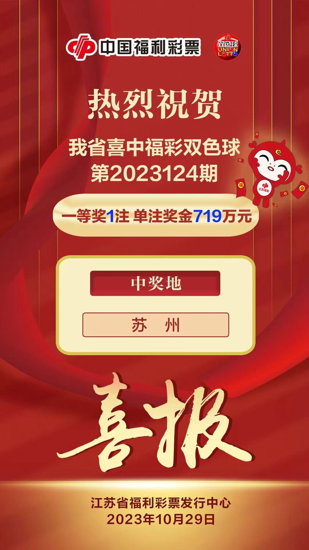 昆山购彩者中双色球头奖,奖金达719万元!