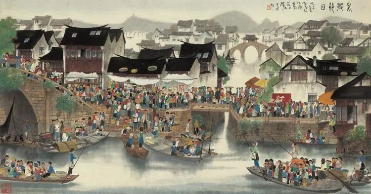 45年前,苏州画家杨明义偶遇了心中的完美水乡,并以此为灵感创作了《水乡节日》,描绘出周庄水乡集市上的热闹场景。