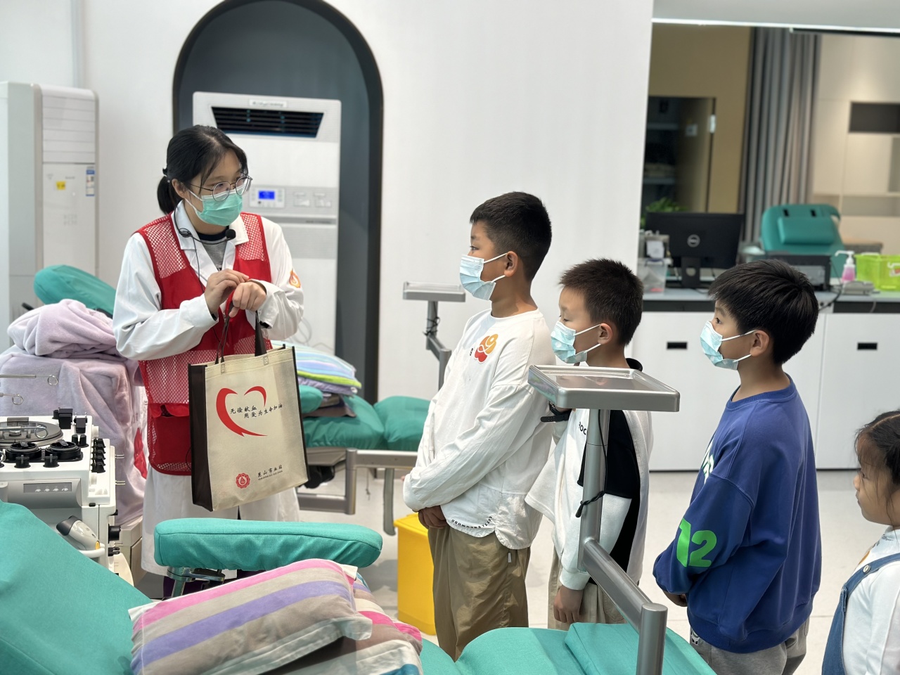 学生在志愿者的带领下,现场学习了输血发展史、无偿献血基本知识和“一袋血的旅程”等科普知识,了解了血液的采集、制备、检测及储存等过程。