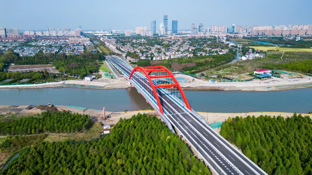 南起上海市青浦区胜利路,跨过吴淞江航道后,北至江苏省昆山市香榭丽大道,全长0.851公里。主桥吴淞江特大桥全长154.2米,桥梁总宽33.9米,全桥用钢量2800吨,拱肋与系梁之间采用34根吊杆连接,桥面由144片混凝土预制板拼接而成。作为南北向融合发展轴的重要节点,这座桥梁串联昆山花桥与上海青浦城区以及嘉定安亭,为两岸居民提供方便的同时,也将进一步推动长三角高质量一体化发展。