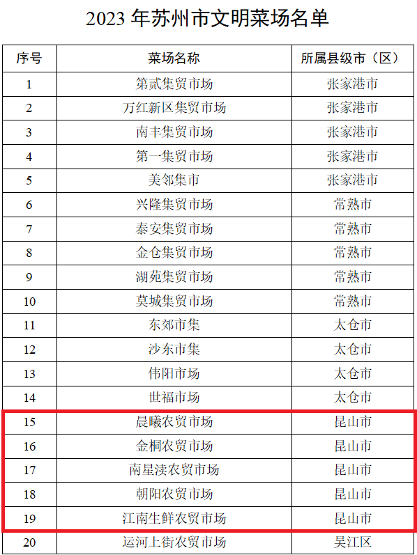 2023年苏州市文明菜场名单日前出炉,我市晨曦农贸市场、金桐市场、南星渎市场、朝阳市场、江南生鲜市场名列其中。
