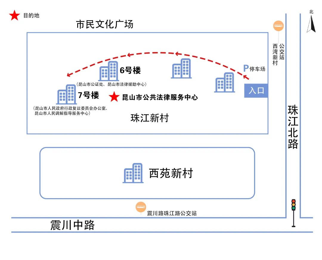 昆山市公共法律服务中心地址:昆山开发区珠江北路珠江新村6号楼、7号楼(如图所示)。