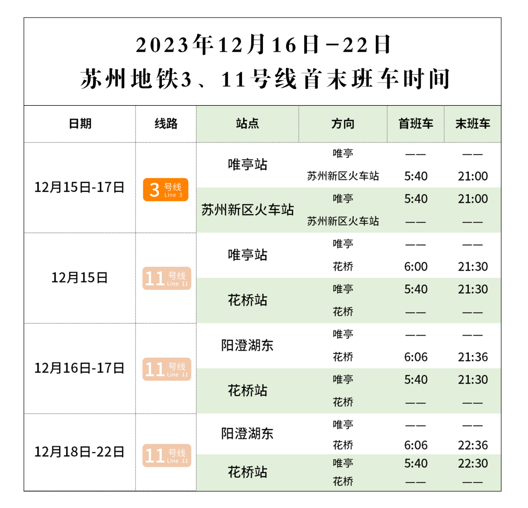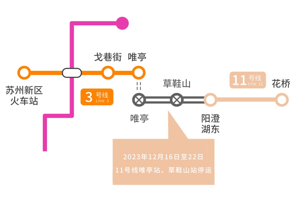 为配合3/11号线贯通运营施工改造,苏州轨交将对3/11号线运营组织作临时调整。具体如下: