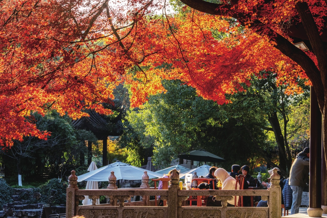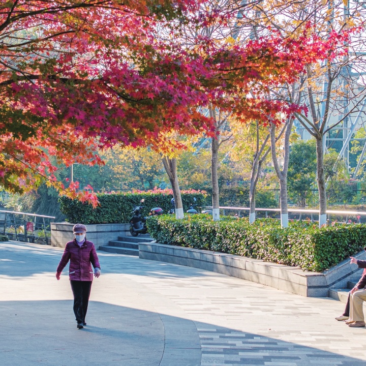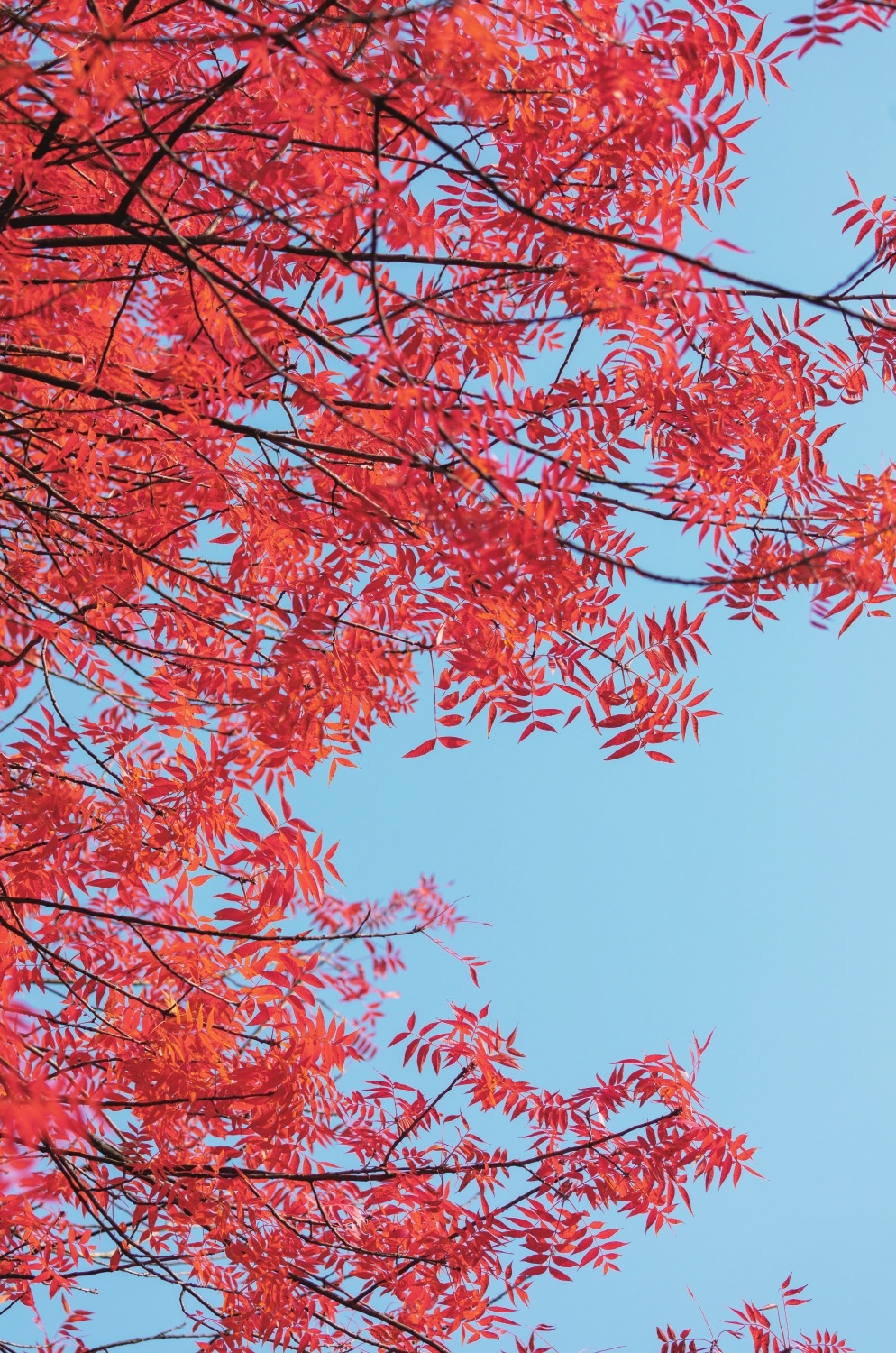 公园里、街道上,乌桕的红叶簇拥在一起,纯粹、明媚、洒脱,像似“冬日里的一把火”,为冷冽的初冬增添了一抹火热的红。