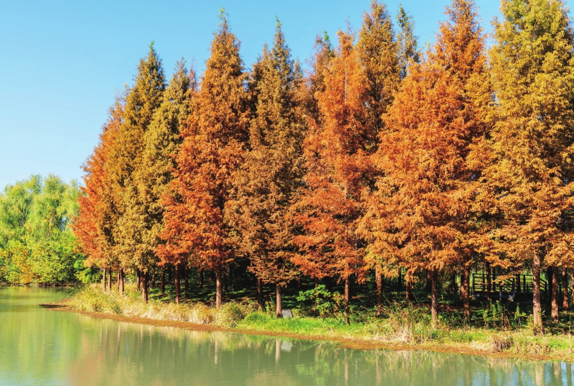 蓝天下、碧水旁,一棵棵水杉交织在一起,像一把把红彤彤的巨伞,远远看去,又像滚动着的火焰染红了晴空;