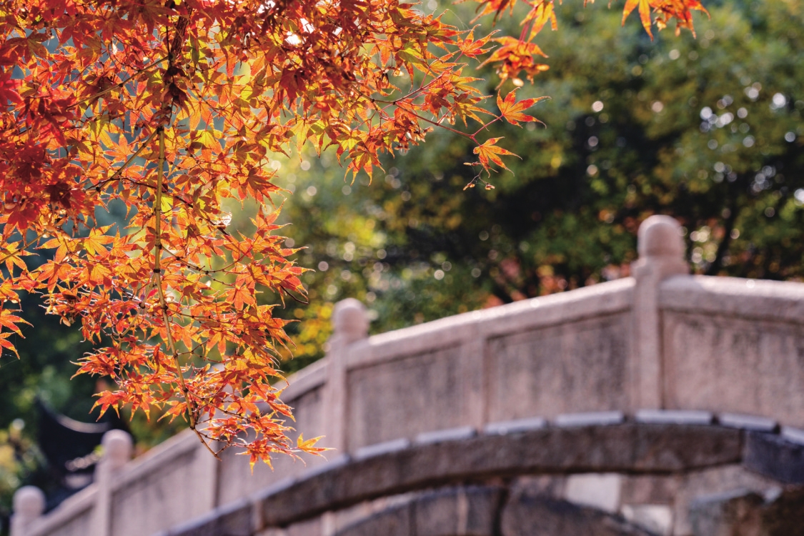 园林里、小榭楼台边,枫树一棵一棵,一排一排,似火似霞,千树流丹;