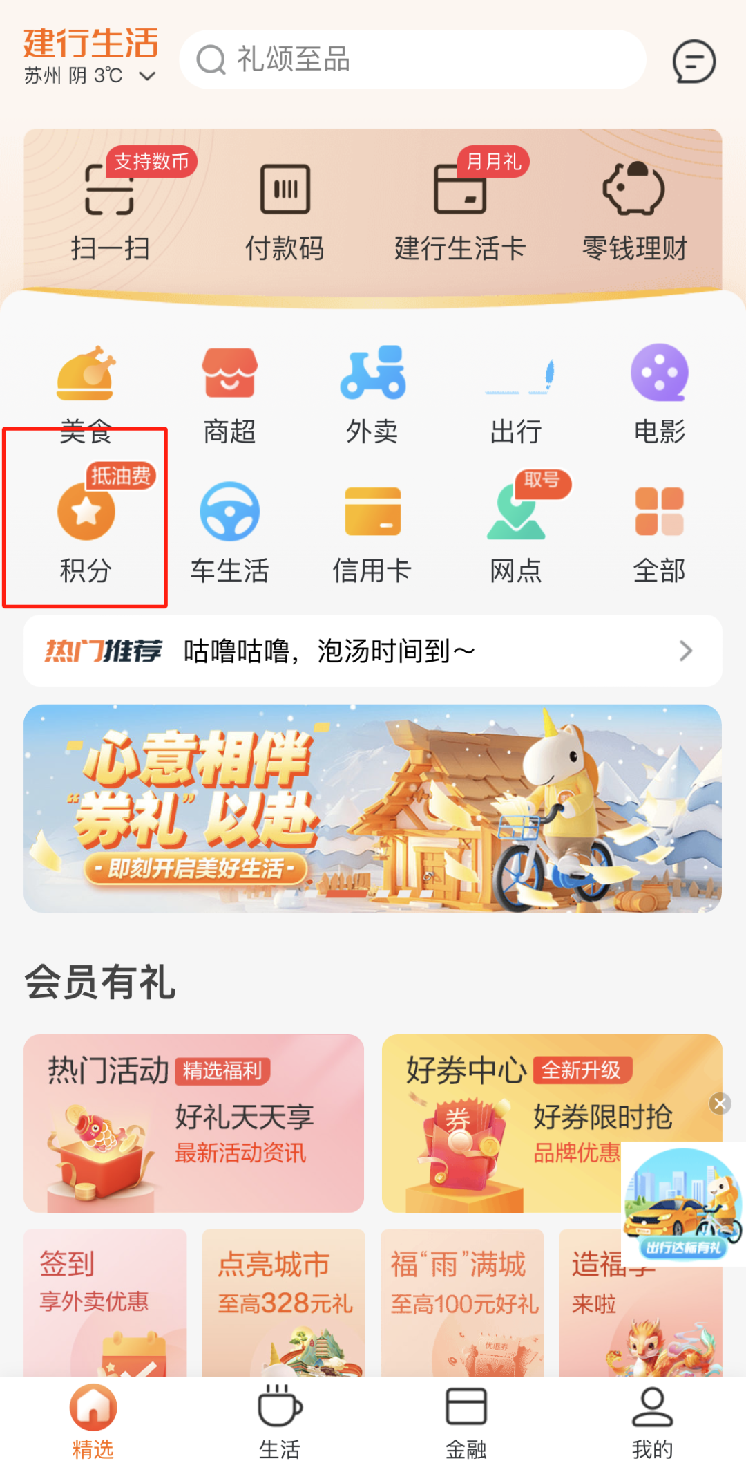 另外,您的积分可以通过“建行生活”APP抵扣现金,抵扣比例为“700积分抵1元”,最小抵现需综合积分为7分,即0.01元。目前支持加油充值、外卖、电影票、会员充值、骑行、打车等多场景。