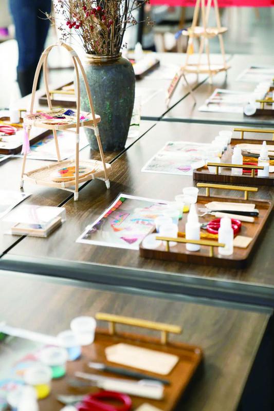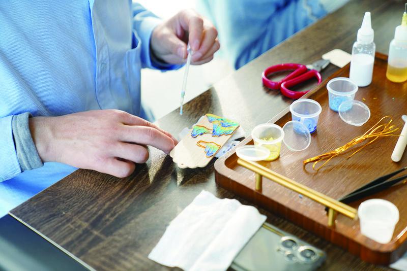 随后,老师详细讲解了掐丝珐琅书签的制作方法与步骤。活动参与者们在老师的指导下,将金属细丝按照拓印好的花纹弯曲固定在书签上,然后按照自己的经验与喜好选取不同色彩的釉料加以填充,点蓝后将表面釉料磨平使金属细丝显露,最后封层,将生动精美的图案定格,完成书签制作。通过此次活动,参与者们在实践中接触、学习了非遗文化,再续传统艺术的美与浪漫。