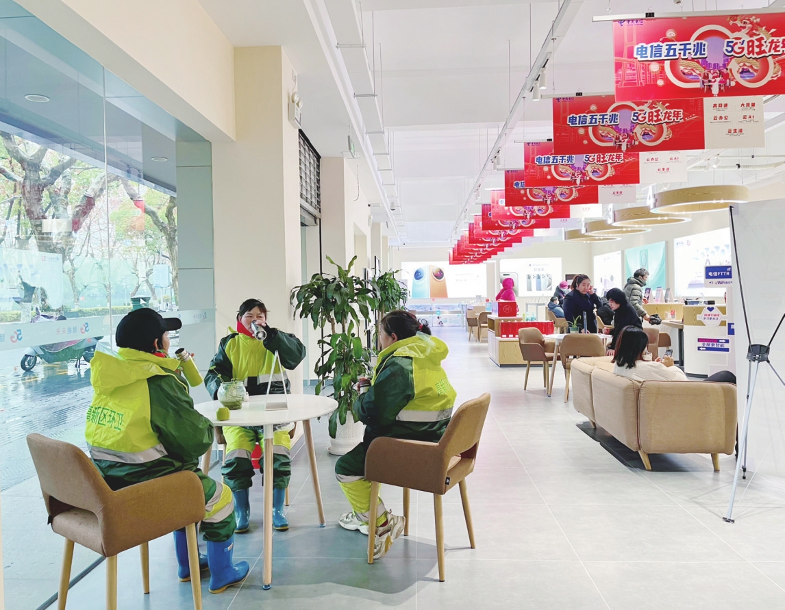 在相关部门全力增设环卫休息亭的基础上,我市不少沿街商铺也在店内设立爱心驿站,为环卫工人提供便利。在中国电信昆山分公司震川路营业厅的爱心驿站内,桌椅、饮水机、微波炉、冰箱、护手霜、药品、针线包等物品一应俱全,现场休息环境暖心舒心。该营业厅终端店长宋平表示,环卫工人起早贪黑、栉风沐雨,用辛劳和汗水换来城市的美丽和整洁,令人感动。“我们还考虑在驿站内增加面包等补给物资,希望通过小小的举动,让他们在寒冬天感受到浓浓的暖意。” 宋平说。