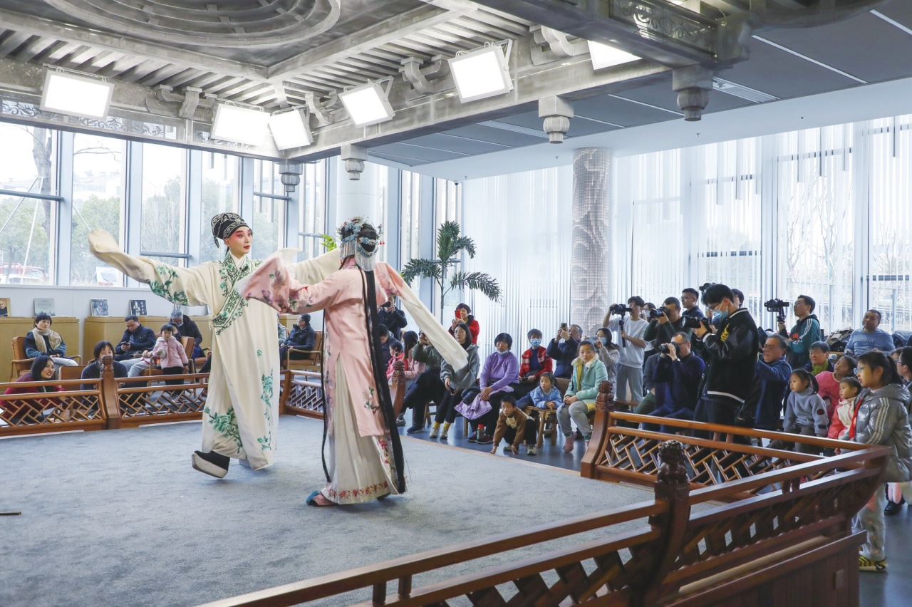 “原来姹紫嫣红开遍,似这般都付与断井颓垣……”2023年12月30日上午10点30分,在文创咖啡厅·戏台,一曲《牡丹亭·惊梦》吸引了众多市民驻足聆听,4个小时的表演让戏迷过足戏瘾。“放假和朋友一起来玩,没想到还能听到一段精彩的昆曲,真的太开心了。”市民袁超说。“我们连续三天都有演出,有昆曲、沪剧、越剧等节目,都是免费的,市民无需预约就可以来现场欣赏。假日期间,我们还邀请了专家开展博物馆公开课,讲述昆曲在阳澄湖畔萌发和逐步形成的过程。我们还举行了打卡活动,活动期间,每天参与主题打卡的前50名观众可获赠博物馆限定小礼物。”戏曲百戏博物馆相关负责人说。