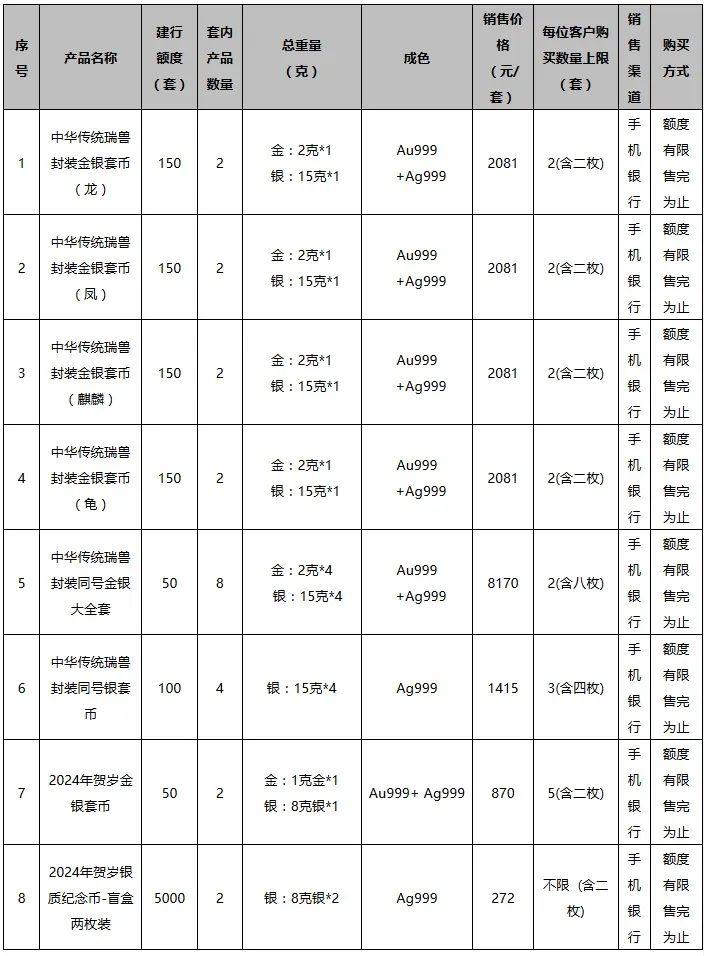 根据中国人民银行贵金属纪念币发行安排,“中华传统瑞兽金银纪念币和2024年贺岁金银纪念币”分别于9月和12月陆续发行,我行根据安排将参与以上两个项目的第二轮销售工作。现将有关事项公告如下: