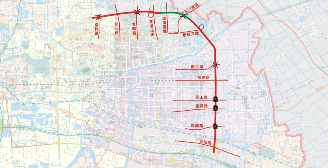 工程北起城北路-紫竹路交叉口,南至东城大道-金阳路互通,全长17.94千米。主要新建紫竹路、青阳路、宋家港路-S339和南浜路四座跨线桥,新建翠微路定向匝道和优化黄浦江路互通;新建景王路、洪湖路2个下穿隧道;提升前进路、昆嘉路2个下穿隧道。
