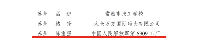 中国人民解放军第6909工厂金工车间工艺员、国务院政府特殊津贴获得者陈重强获评江苏省卓越技师A类。