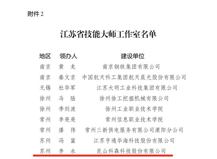 昆山科森科技股份有限公司李永技能大师工作室获评江苏省技能大师工作室。该工作室自创立以来牵头攻克了15项企业技术难题,申请发明专利2项、实用新型专利10项。同时,该工作室还充分发挥高技能人才“传、帮、带”之责,致力于集团技能人才梯队建设,先后为企业培养技能人才263名、高级工及以上高技能人才80人,团队有3名成员入选2022年度昆山市有突出贡献高技能人才。