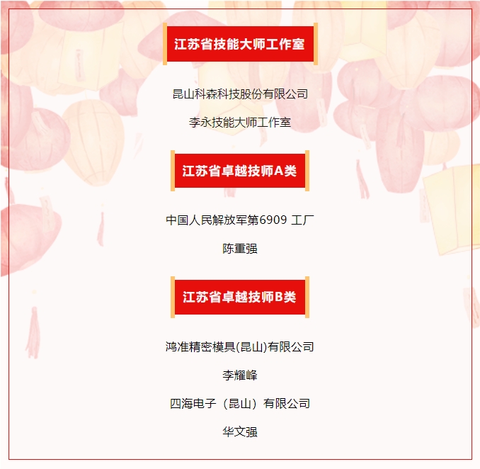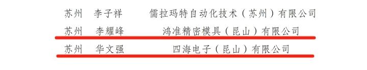 鸿准精密模具(昆山)有限公司机构开发课课长李耀峰,四海电子(昆山)有限公司资讯部副经理、昆山市人民政府人才津贴获得者华文强获评江苏省卓越技师B类。
