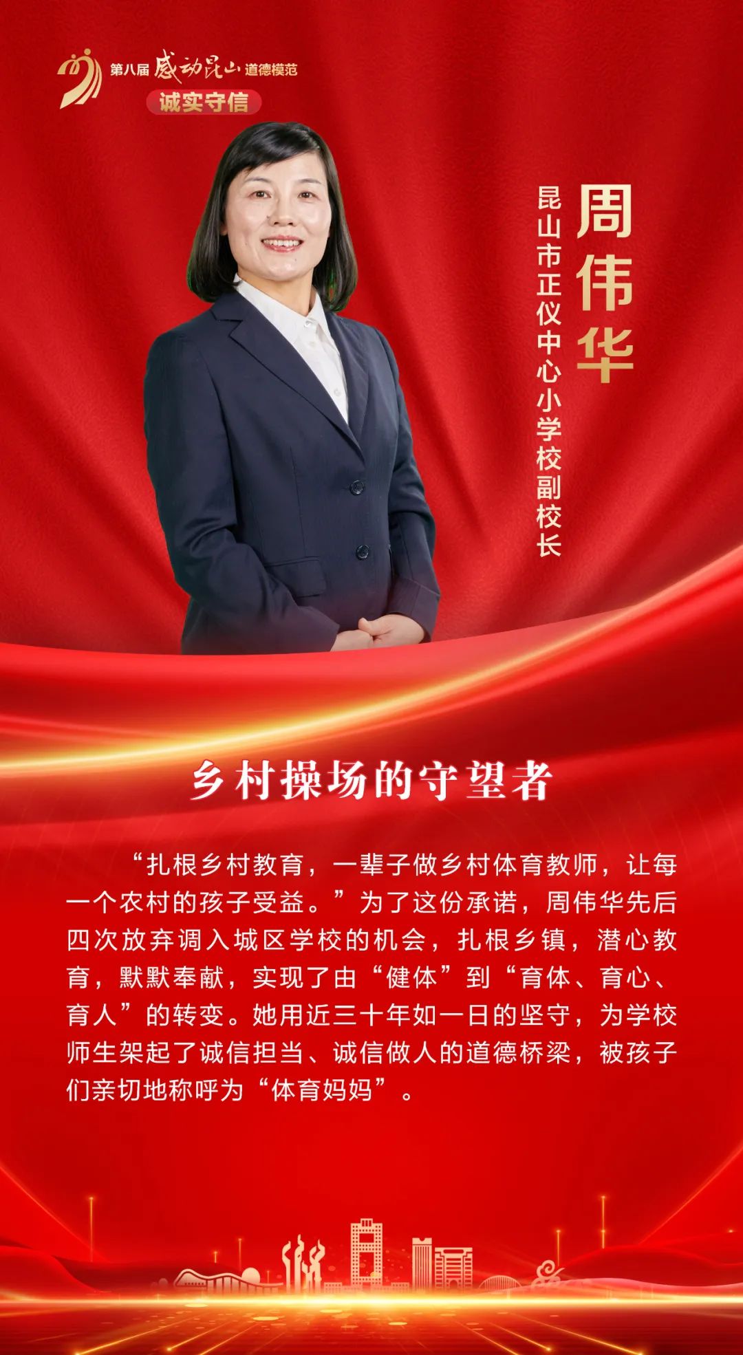 她潜心教坛,默默奉献,耕耘乡村讲台整整27年,她用自己的坚守和信念实现了由“健体”到“育体、育心、育人”的华丽转身;她用自己的真心和真情哺育万千桃李,成为孩子们心中的“体育妈妈”,演绎了一个平凡体育教师的精彩人生。