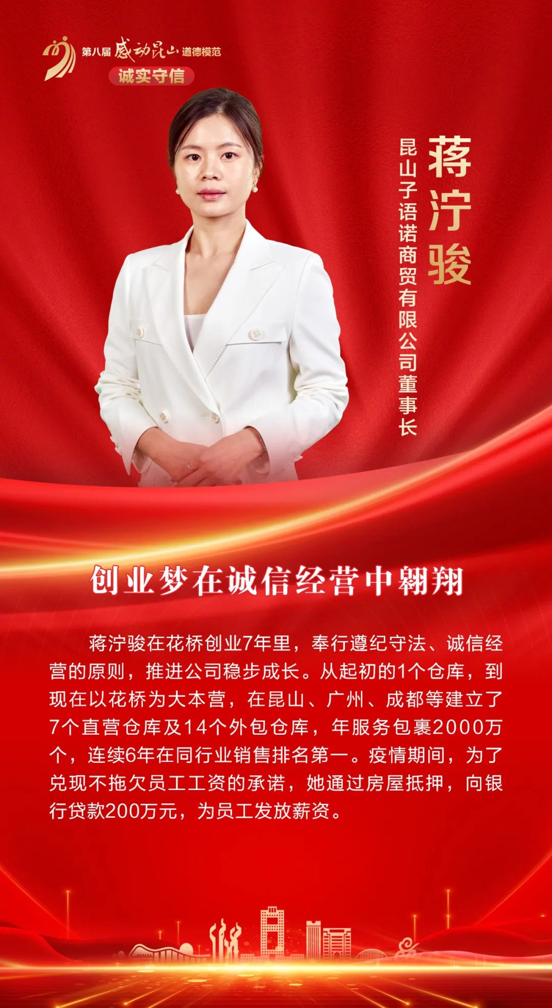 蒋泞骏,女,1986年生,中共党员,昆山市花桥镇徐公桥社区居民,昆山子语诺商贸有限公司董事长、党支部书记,昆山市女企业家协会副秘书长。