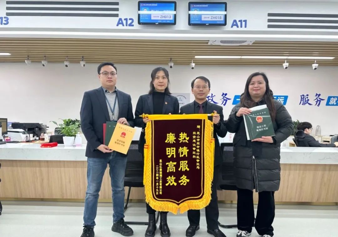落户于周市镇的昆山亿泰玻璃工业有限公司是一家生产药品、食品、化妆品包装容器的规上企业。今年初,周市镇行政审批局投资建设审批科负责人吴黛妮在走访企业中了解到,该公司有扩大投资意愿需扩建厂房的需求。随即,她带领重大项目服务队快速响应,按时间节点开展好前期介入、预先辅导、提前预审三个服务,全力保障企业申报与项目审批同频推进。1月19日下午,周市镇行政审批局将四证同步交到企业负责人手中。