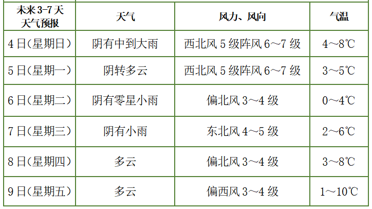 今天夜里阴有小到中雨;明天阴有中雨、局部大雨;后天阴有中到大雨。 东北风4级左右。 明晨最低气温:3~4℃, 明天最高气温:6℃左右。