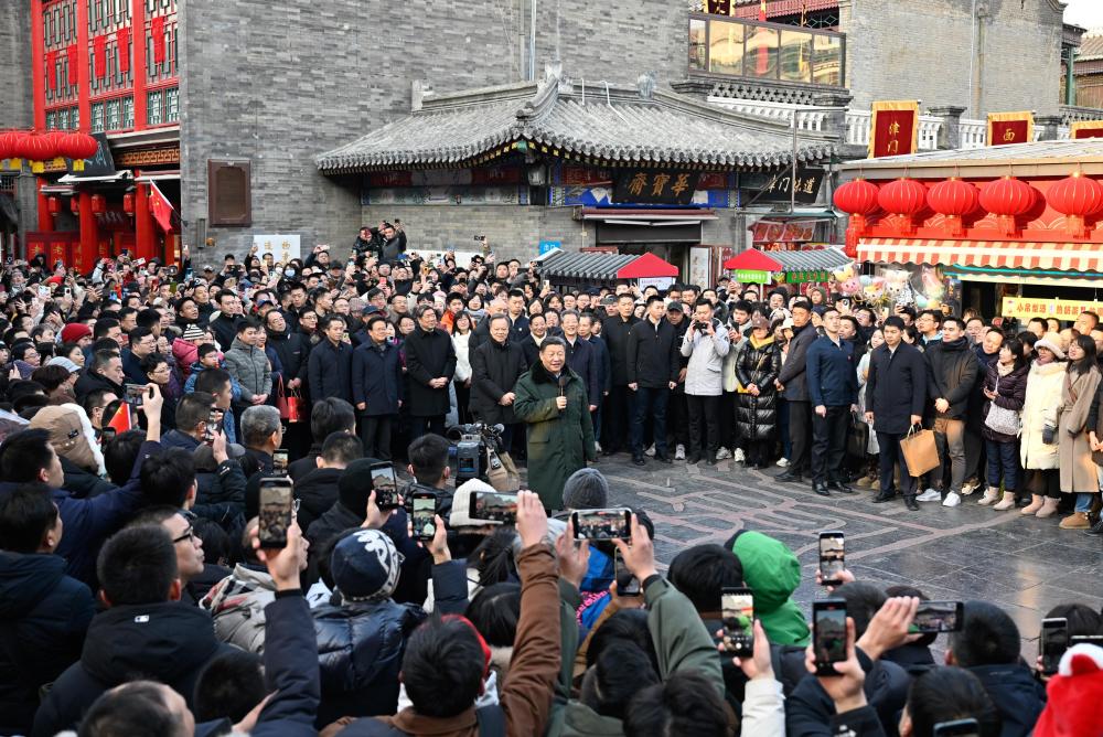 2月1日至2日,中共中央总书记、国家主席、中央军委主席习近平来到天津,看望慰问基层干部群众。这是1日下午,习近平在天津古文化街考察时,同现场群众互动交流。新华社记者 鞠鹏 摄
