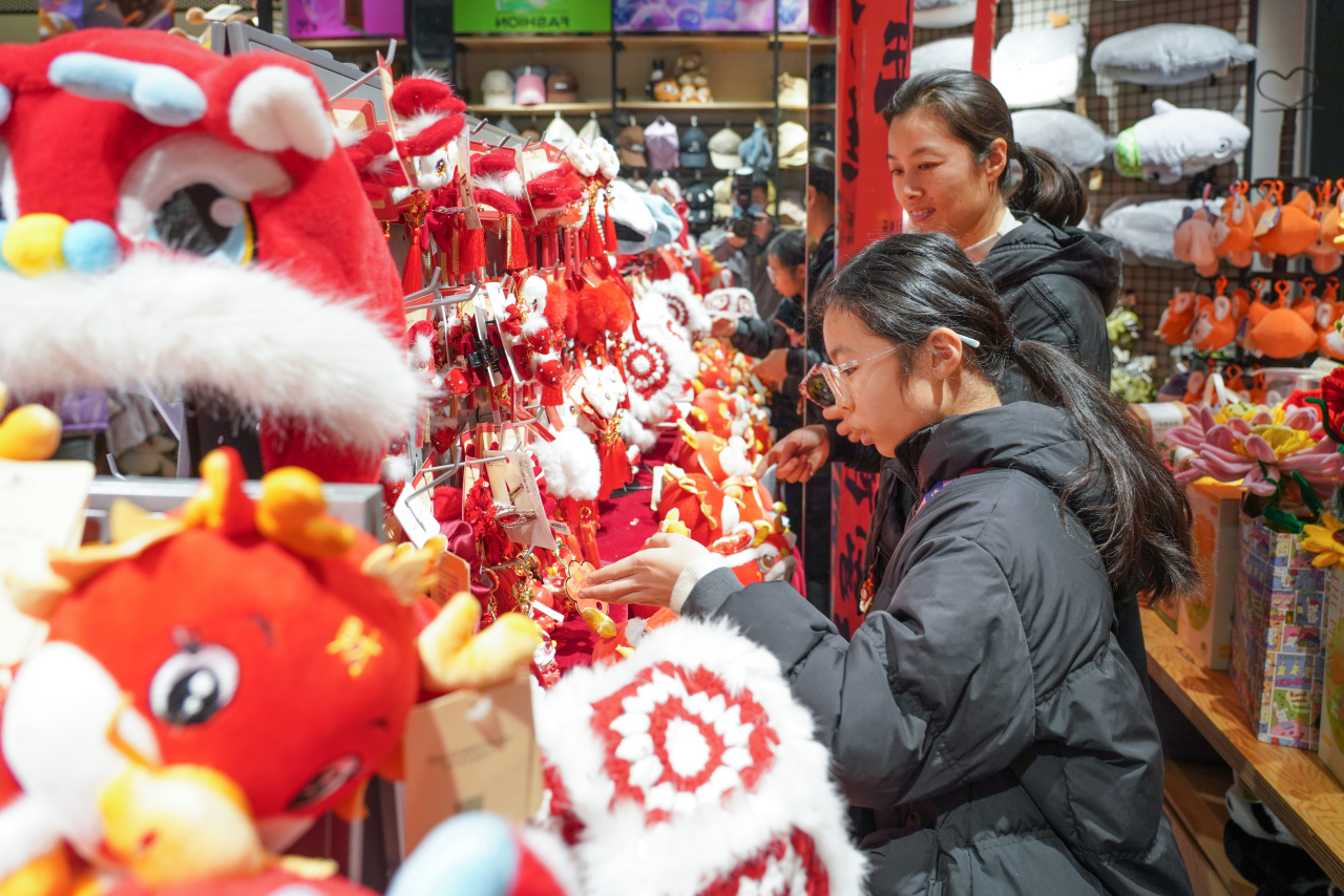 在昆山万象汇,位于商场一楼的“温暖迎春”年货市集上,糖葫芦、彩灯、龙年小饰品等年味产品琳琅满目,吸引了不少市民驻足。大年初一至初六,万象汇还精心推出安徒生世界插画展、舞狮迎春、财神入场、鸿运刮刮乐等一系列活动。此外,各大品牌商都推出了不同程度的优惠活动,多款热销产品最高可享“买一送一”优惠。