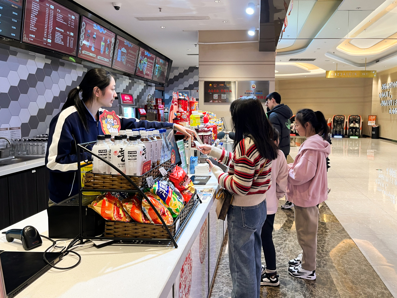 走进中影国际影城昆山花园城店,现场节日气氛浓厚。“好运常在”“多喜乐,长安宁”等红色喜庆宣传语条幅引得消费者拍照打卡;另一边的饮品小食柜台区,“招财进宝”“狮狮如意”“大吉大利”等新春套餐琳琅满目。