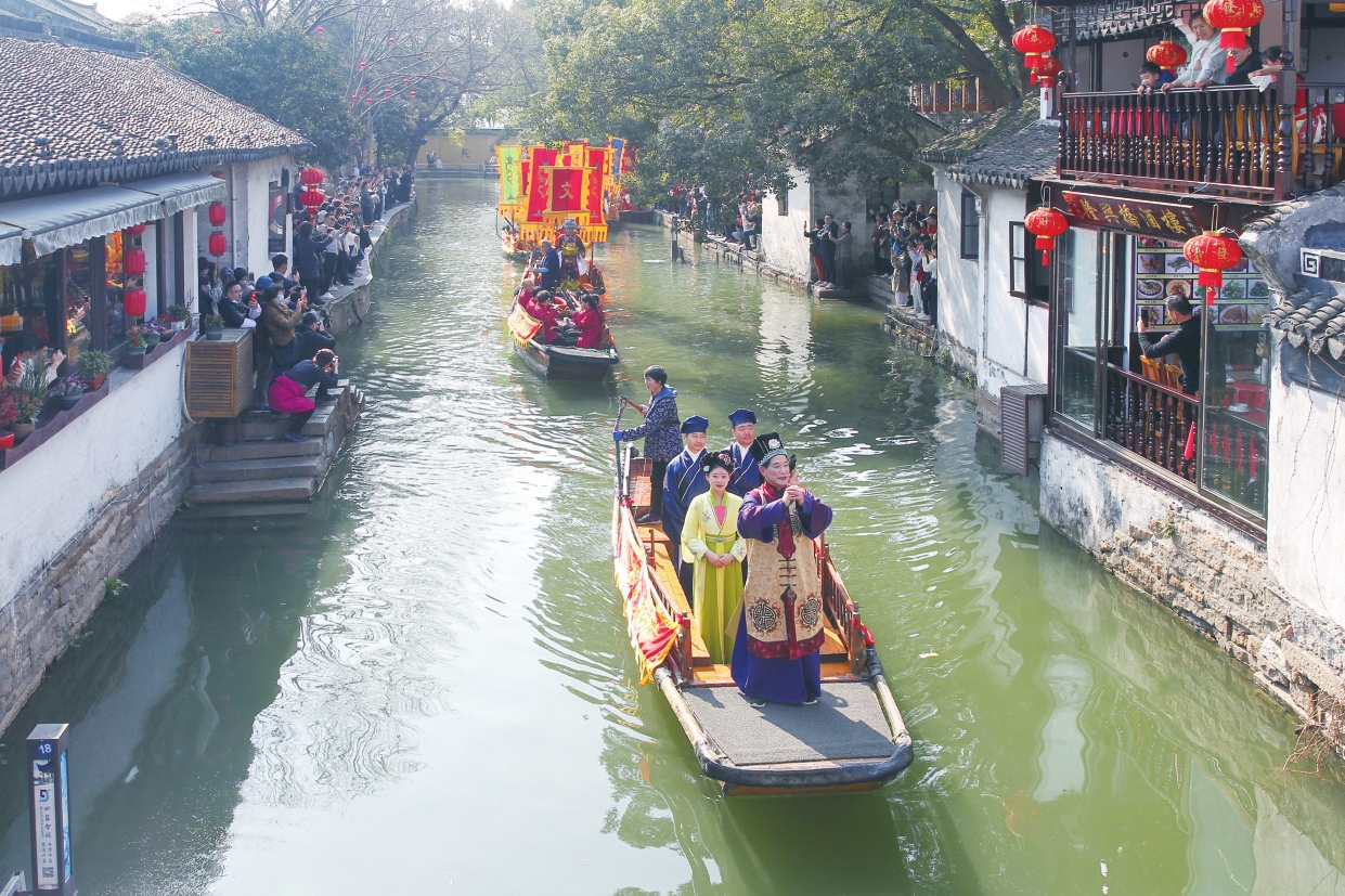 正月初一“打春牛”,被誉为“中国第一水乡”的周庄景区游人如织。金灿灿的“春牛”立于周庄古牌楼下,周围人头攒动,周庄“庄主”敬香、洒酒、叩拜,祭祀春牛,祈求国泰民安、风调雨顺;正月初五,周庄举行了独具江南特色和民间风俗的水乡财神节,祈祷来年平安和顺,吸引众多游客感受江南传统年俗。