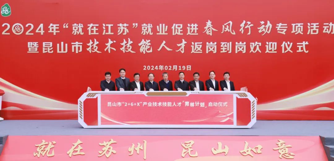 匠心铸就梦想,技能成就未来。2月19日,2024年“就在江苏”就业促进春风行动专项活动暨昆山市技术技能人才返岗到岗欢迎仪式举行,在昆吹响全省节后返岗复工冲锋号,努力以就业之稳、筑民生之基、促经济之好。省人社厅党组书记、厅长王斌,苏州市委常委、昆山市委书记周伟,苏州市副市长查颖冬,昆山市副市长钱许东,河南省叶县县委常委、常务副县长胡炜哲,罗山县副县长王庆伟等参加活动。