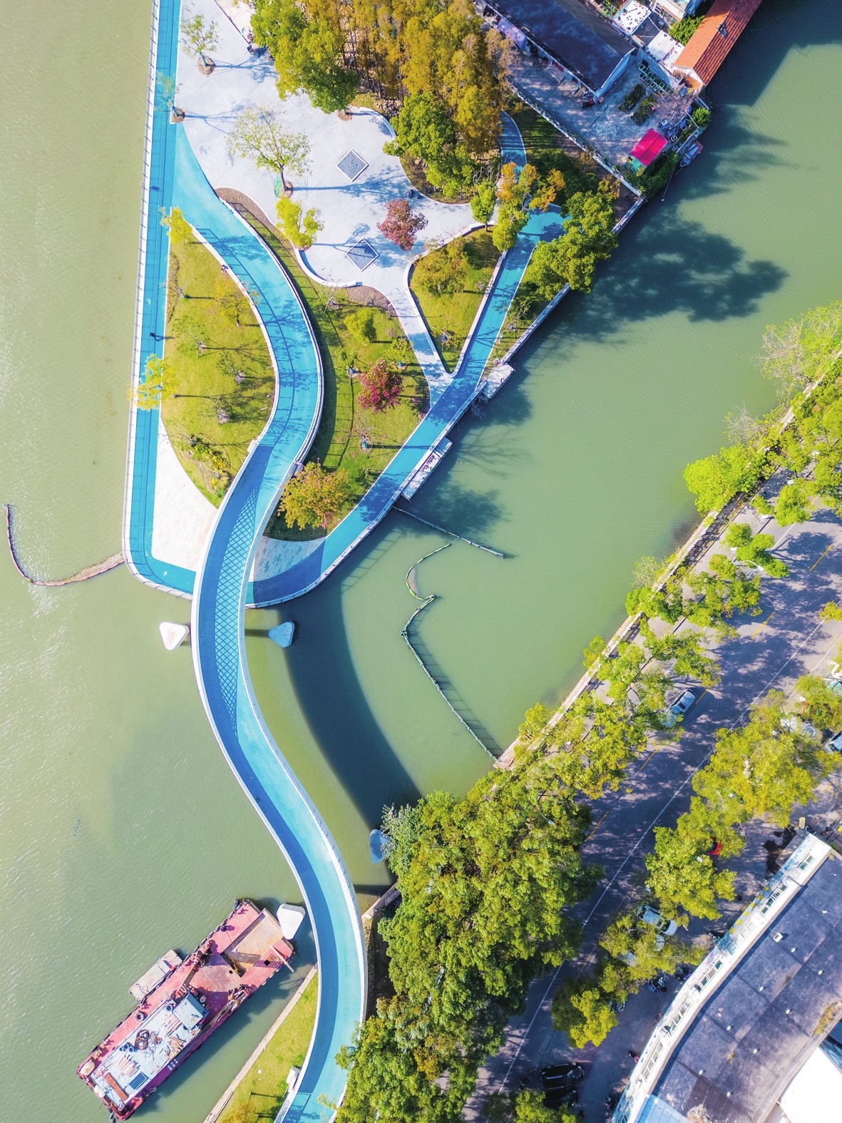 城水相依,人水相亲,水城相融,景城相伴。2023年,环城滨江绿道(一期)工程建设完成,总长约3.8公里,植入“绿”“人”“水”“城”要素,打通滨水岸线,沟通21个小区,串联15个景观节点,更新5处桥下空间,基本连通傀儡湖—庙泾河—张家港河—北环城河—青阳港十公里的滨水活力慢行网络,连接起森林公园、亭林园等大型公园,与多处新增“小薇”绿地空间构建了点线融合、便捷通达的滨水公共休闲网络,用一条道串起一片绿,为市民们提供了亲水平台和休闲运动好去处,也犹如镶嵌在城区的翡翠项链,串起居民的“绿色生活”。