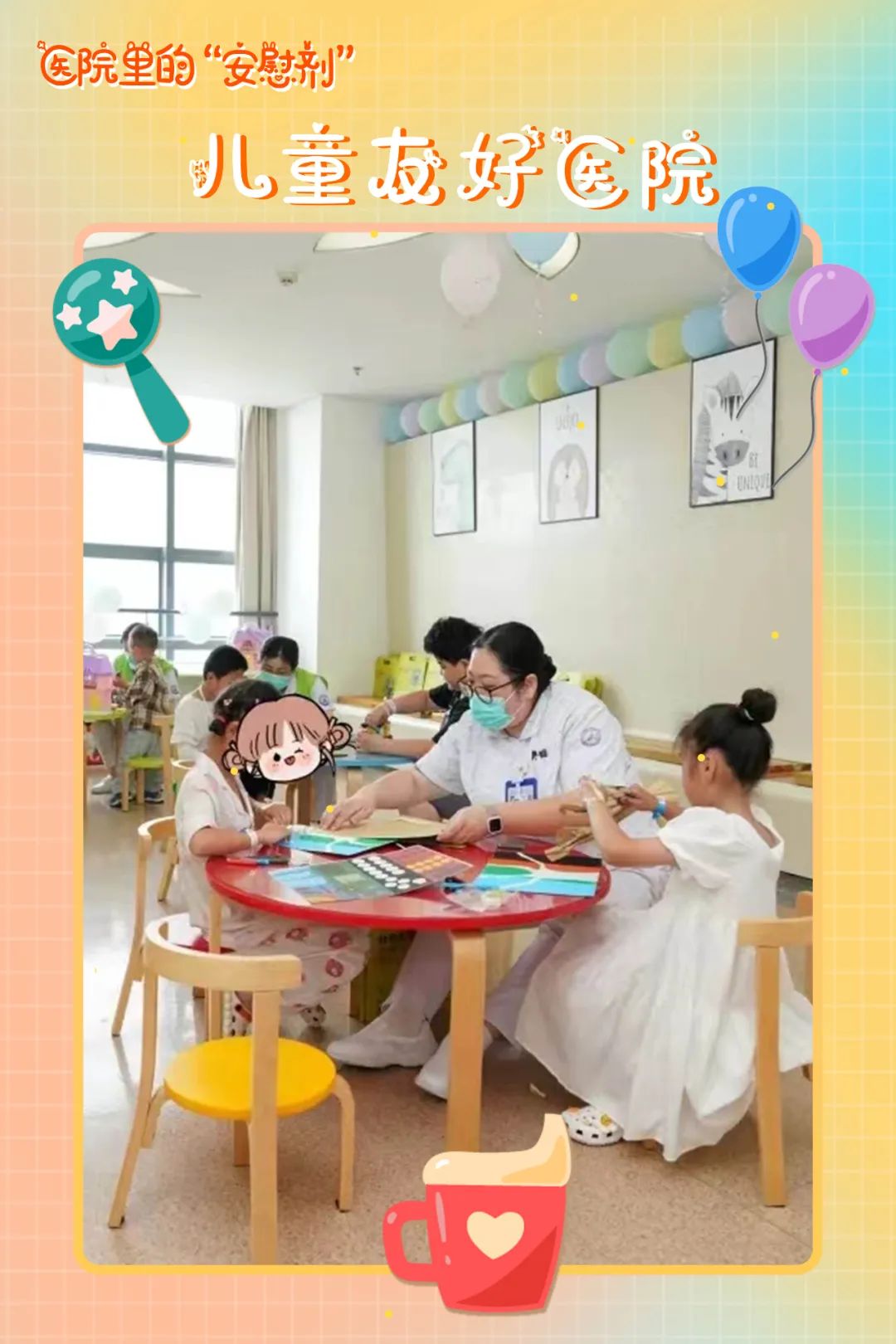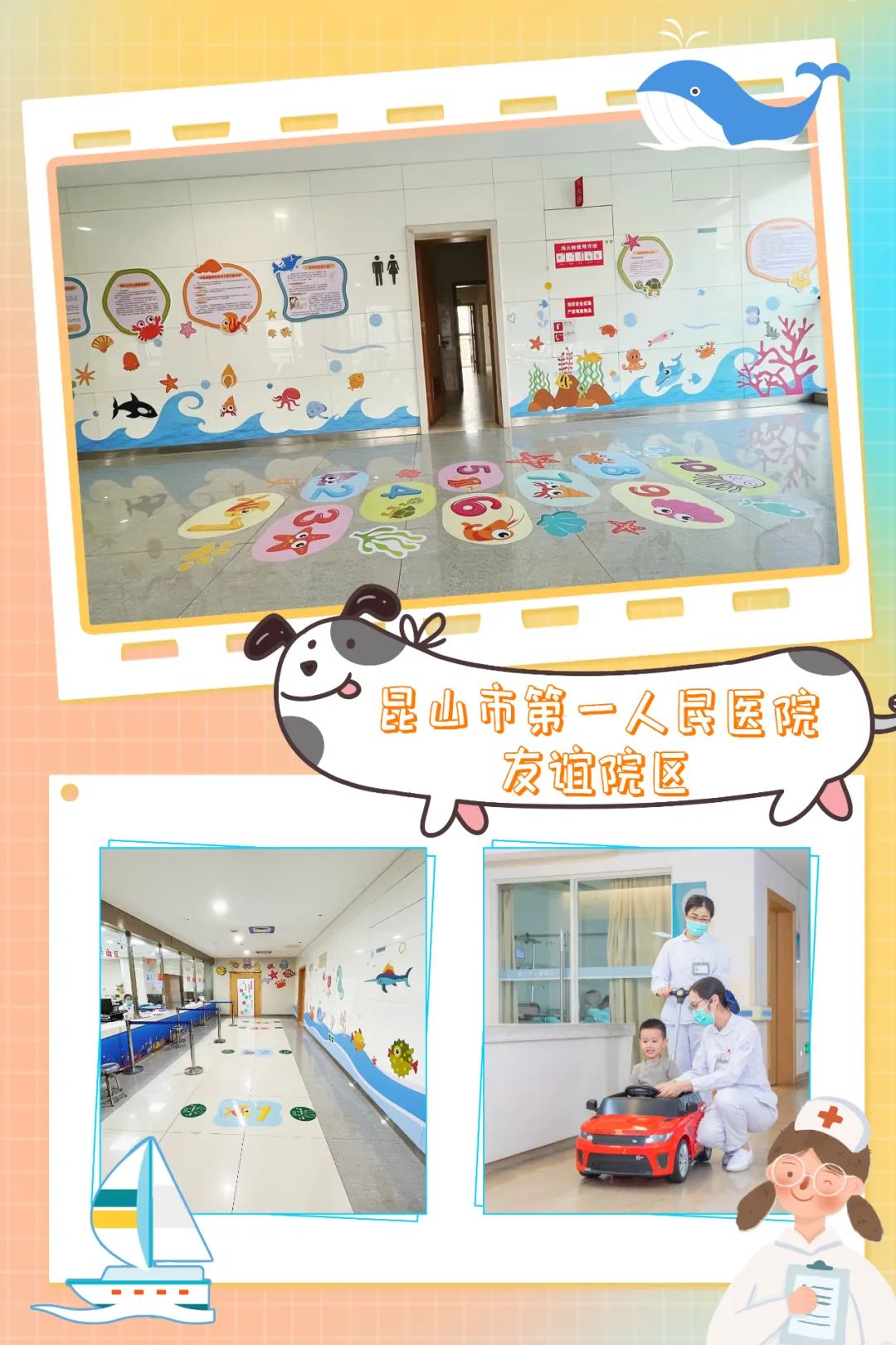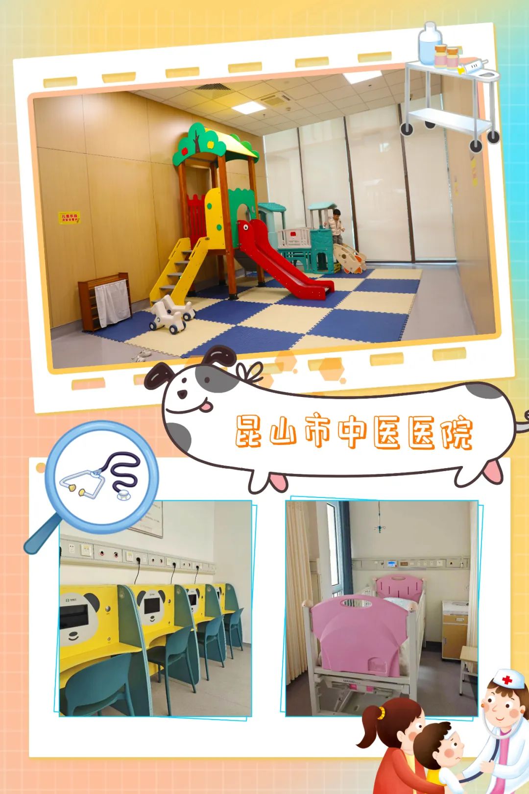 在昆山市第一人民医院友谊院区检验科,无论是抽血还是排队,都会被可爱的海洋精灵包围;在昆山市中医医院,使用可爱的雾化设备、为儿童定制的儿童病房、设置儿童游乐区……活泼有趣的设施设备让医疗环境更温馨。