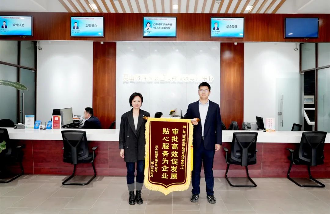 日前,昆山旺湖置业有限公司相关负责人胡女士将一面锦旗送到昆山旅游度假区项目建设审批中心,“昆山速度”令她连连称赞。