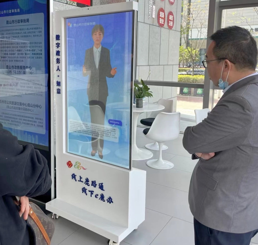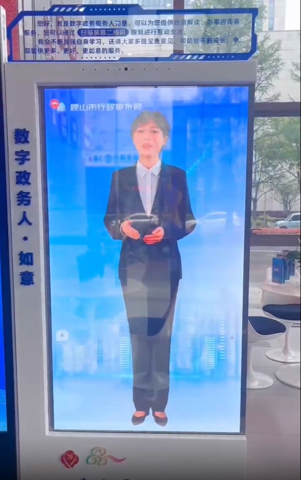 数字人“如意”以昆山政务服务办事人员为原型,通过AI技术将窗口办事人员形象呈现在自助设备、移动端、PC端等终端,形象高度逼真,在解读政策时,语调抑扬顿挫、动作自然顺畅,带来了更加真实的情感互动,有效拉近了服务距离。