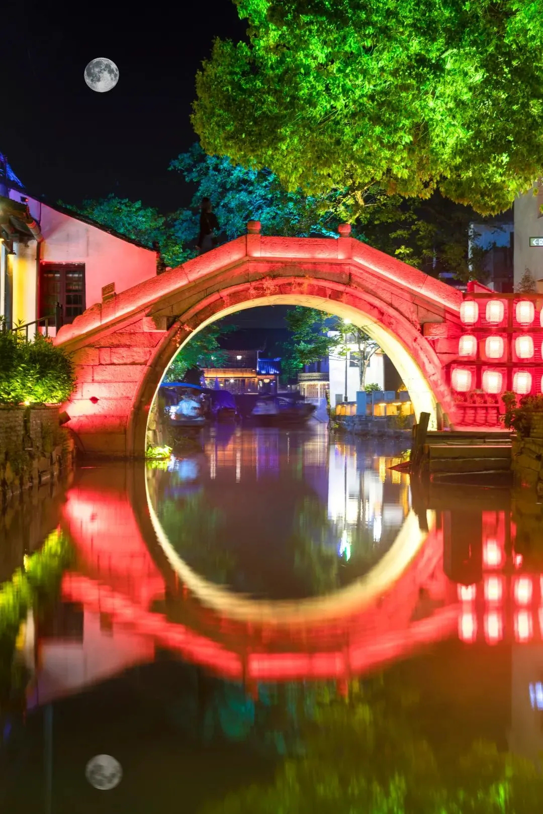 夜周庄,是月光桥畔的甜蜜相拥。穿过古镇一条条古巷狭弄,周庄深处幽静无比,通秀桥立于眼前,红色桥洞与碧水倒影交织成完满的圆,皓月当空,这座姻缘桥不知见证了多少甜蜜的拥抱。