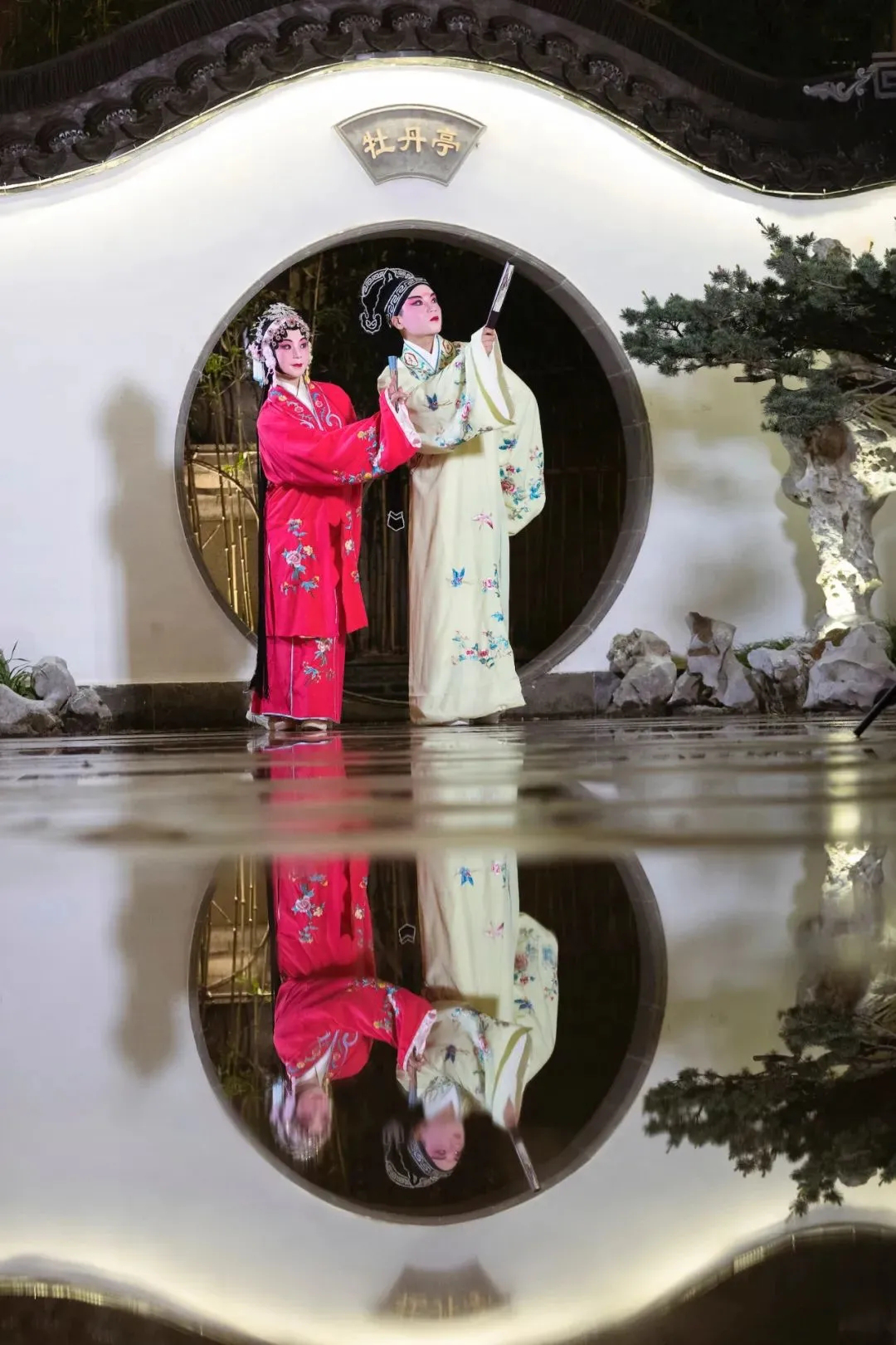 夜周庄,是唱念坐打的梨园盛宴 。软糯细腻的水磨腔,回荡在古色古香的古戏台里。在舞台灯光的笼罩下,飘逸轻柔的水袖,行云如水的台步,唯美典雅,极具江南灵秀之气,杜丽娘与柳梦梅那亦真亦幻的爱情,弥漫在浪漫的夜色之中。