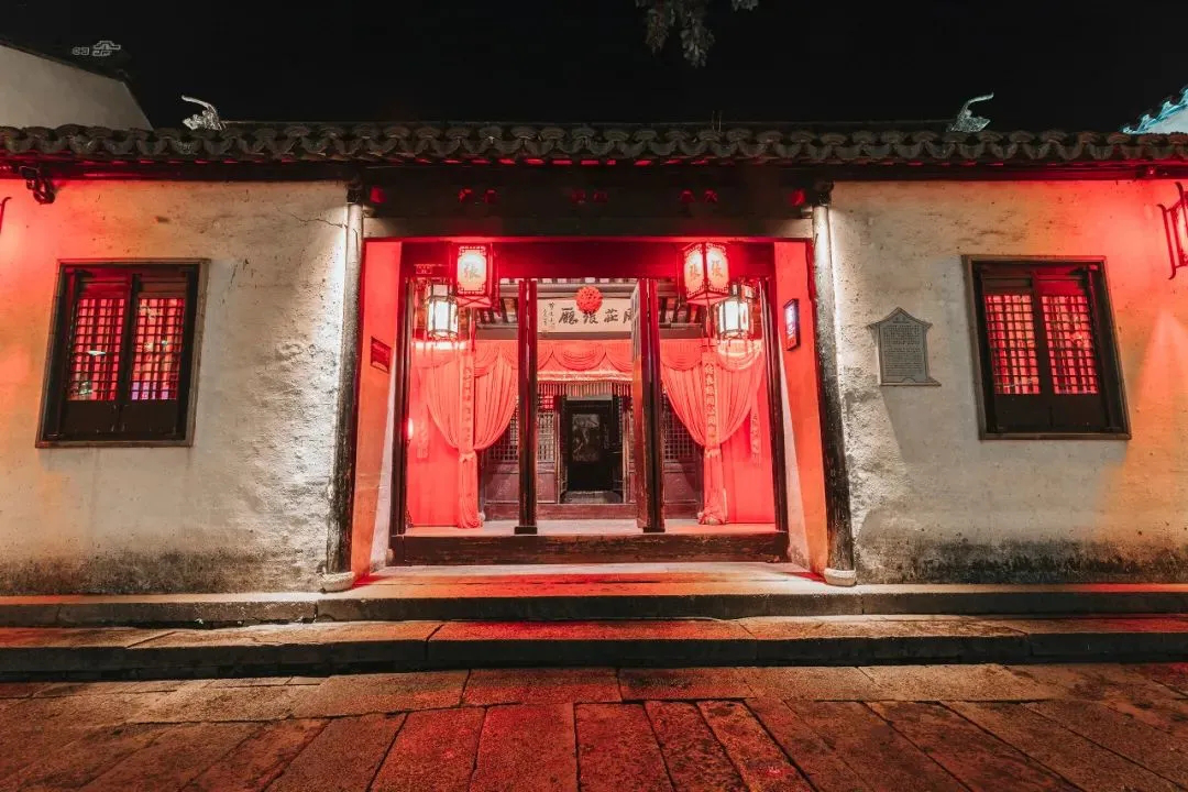 夜周庄,是水乡待嫁姑娘的红盖头。夜囍张厅前的码头上,停靠着大红的婚船,对面的墙壁上投放着水乡婚礼的习俗,音乐中展现着水乡婚礼满满的仪式感,张厅里红色的灯光帷幔,再现了水乡婚俗热闹的场景。身穿秀禾装的新人,脸上洋溢着幸福的微笑。