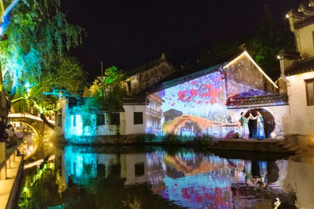 夜周庄,是粉墙黛瓦间的四季轮转 。入夜时分,青龙照壁背后暗藏乾坤,斑驳的粉墙上,投映着春夏秋冬四季的周庄美景,每一幅都美到了极致。撑着油纸伞,身着水袖的水乡姑娘,舞动着曼妙的身姿,和画面里的人物交织在光影里,亦真亦幻,让人真假难辨。