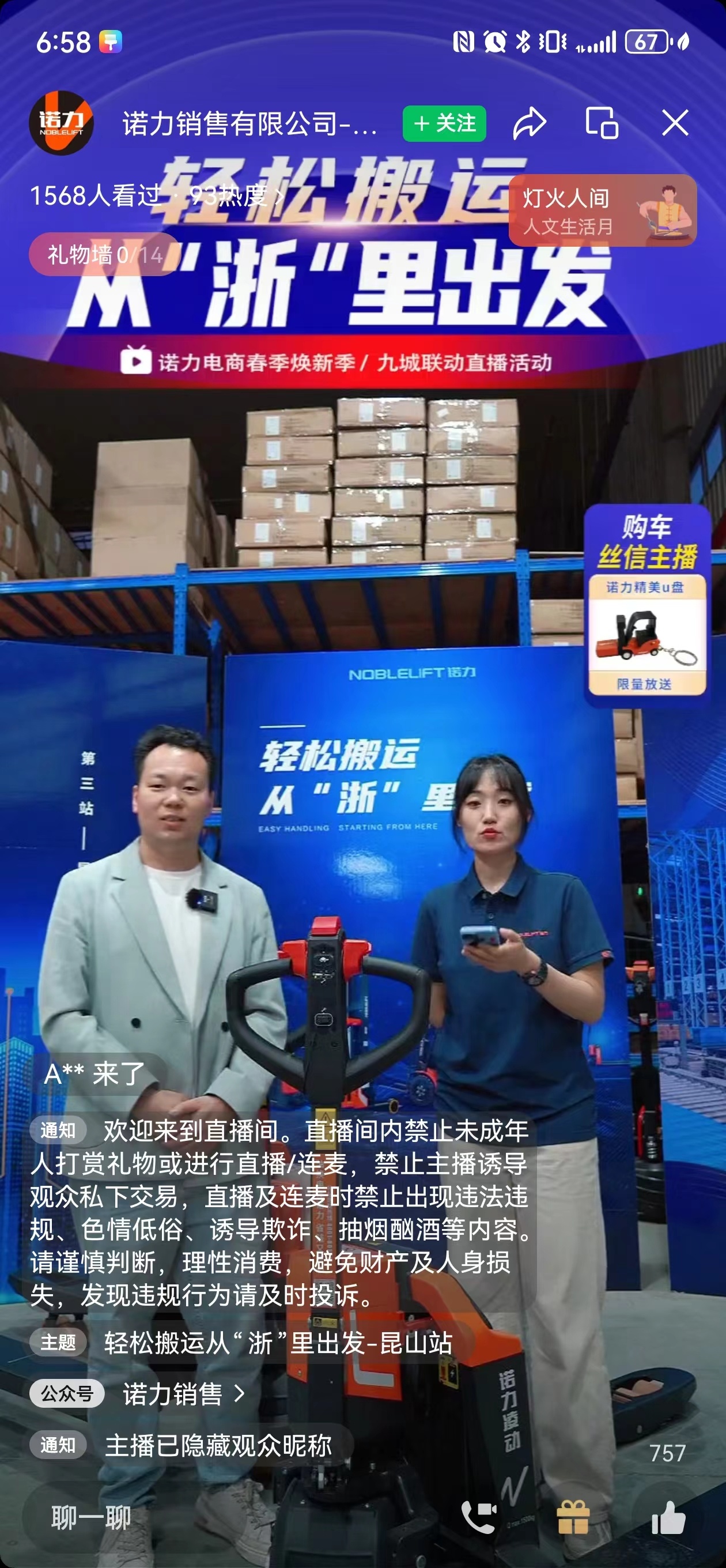 据了解,昆山是诺力集团此次全国巡回直播销售的第三站,两个小时的直播吸引近万人次在线观看,收获1500点赞,部分型号叉车售罄。